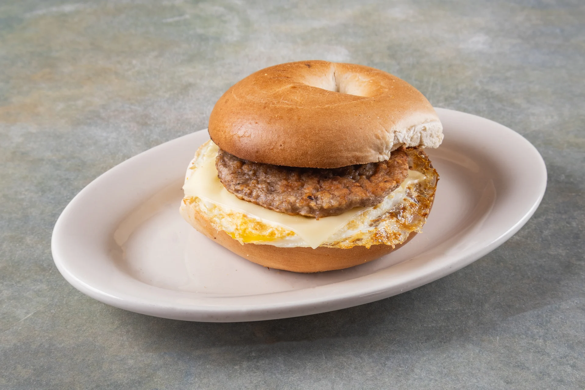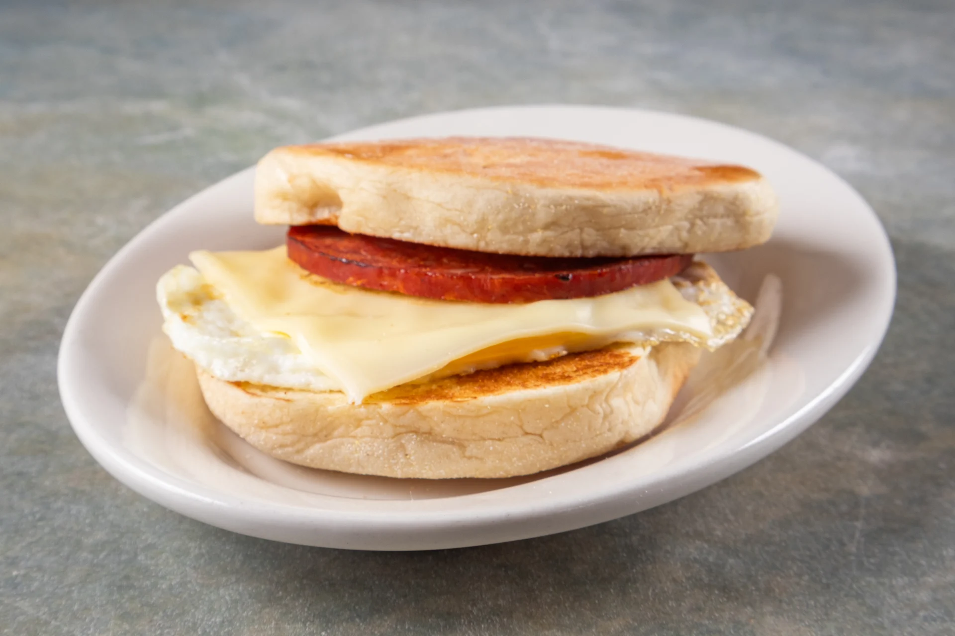 Grilled linguiça patty, egg, & american cheese on a grilled Portuguese sweet muffin.