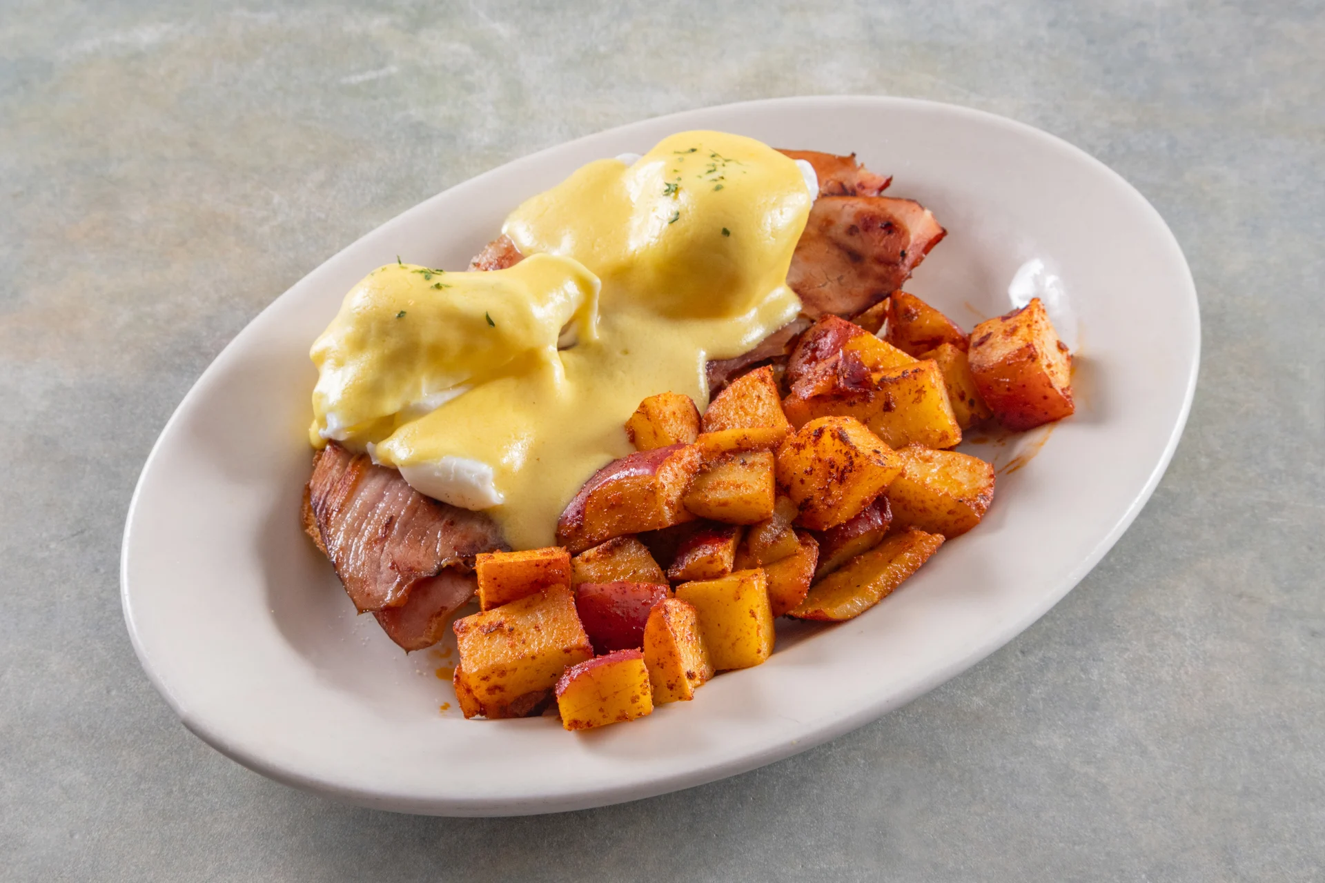 Grilled english muffin topped w/ smoked ham, two poached eggs, & homemade hollandaise sauce.