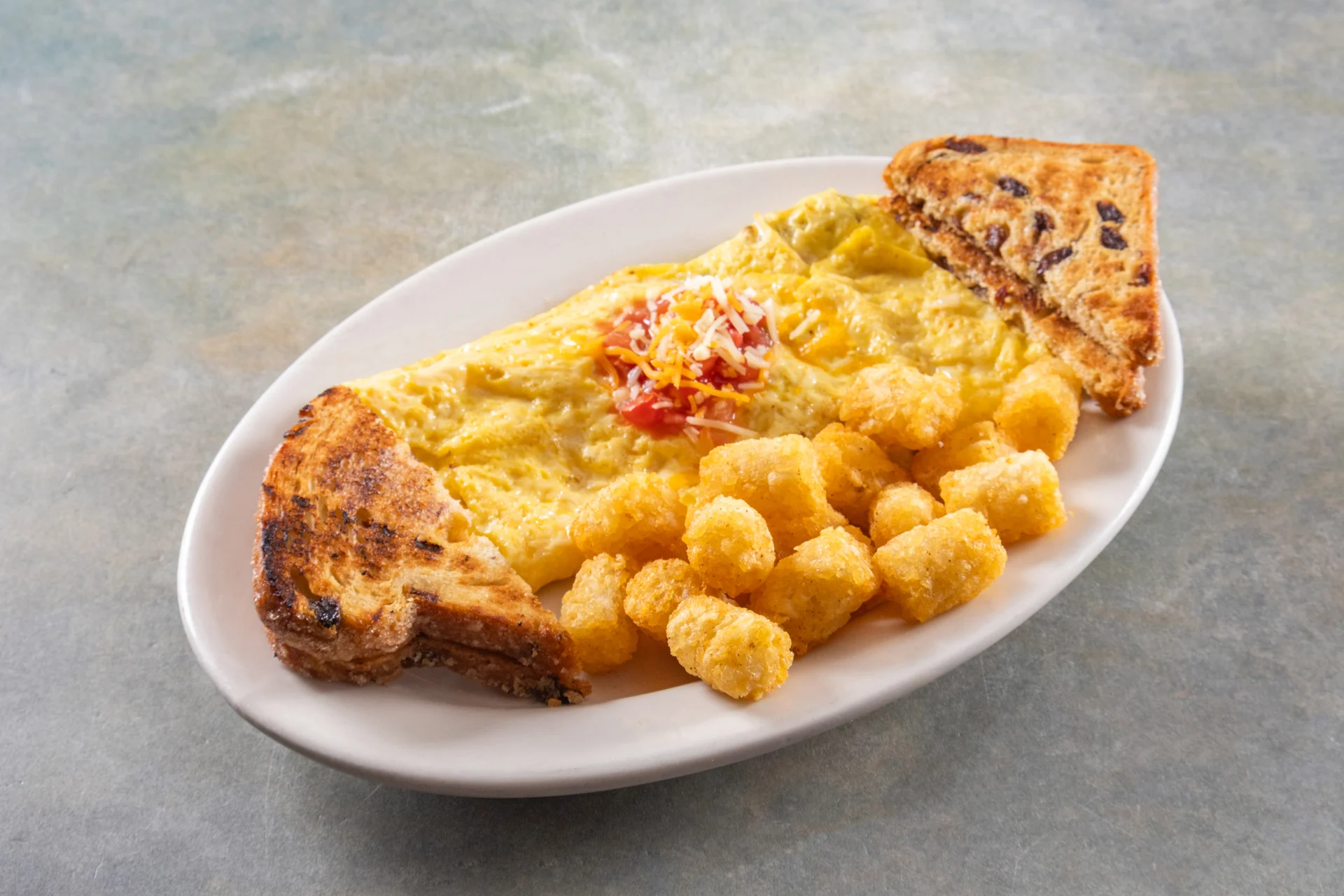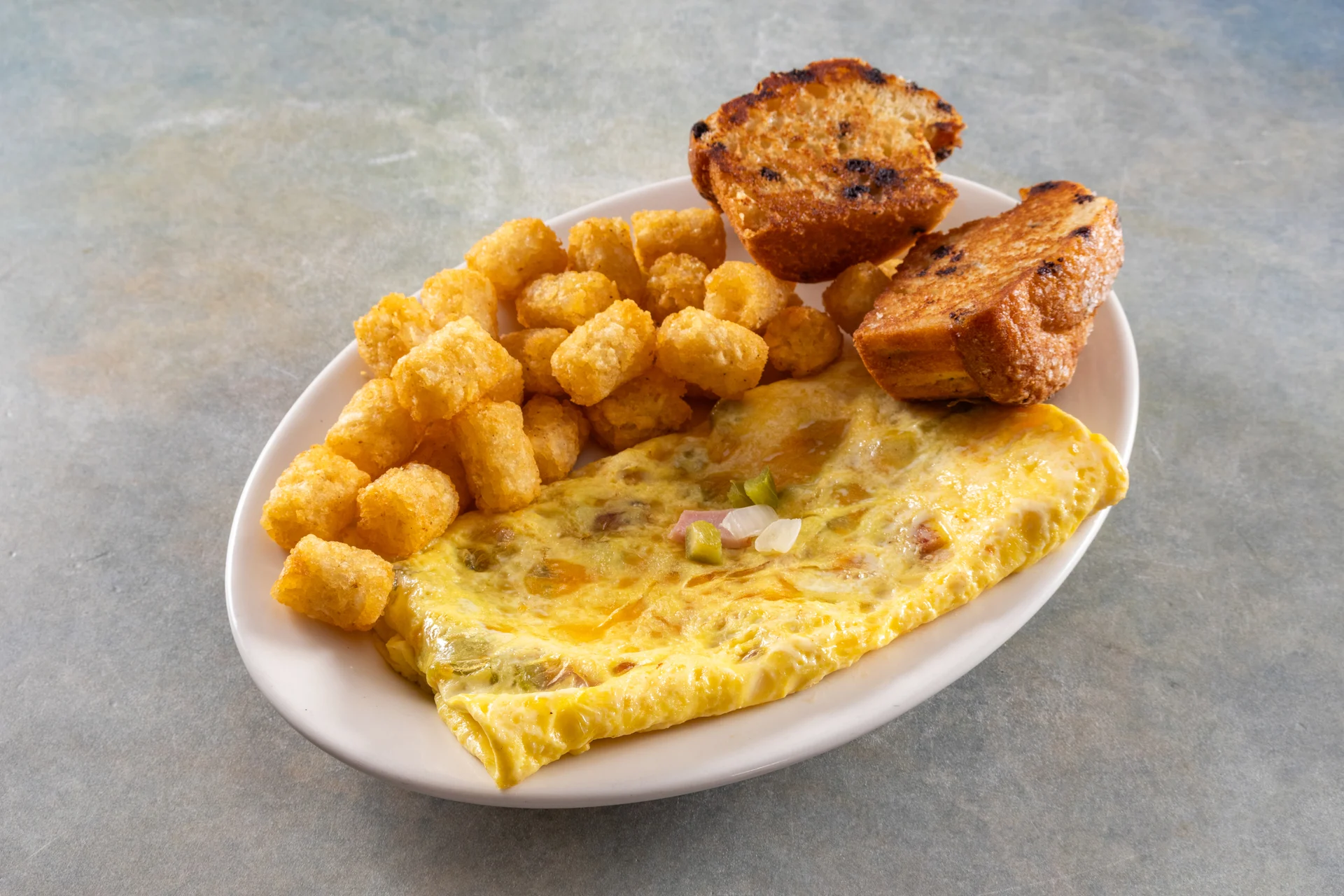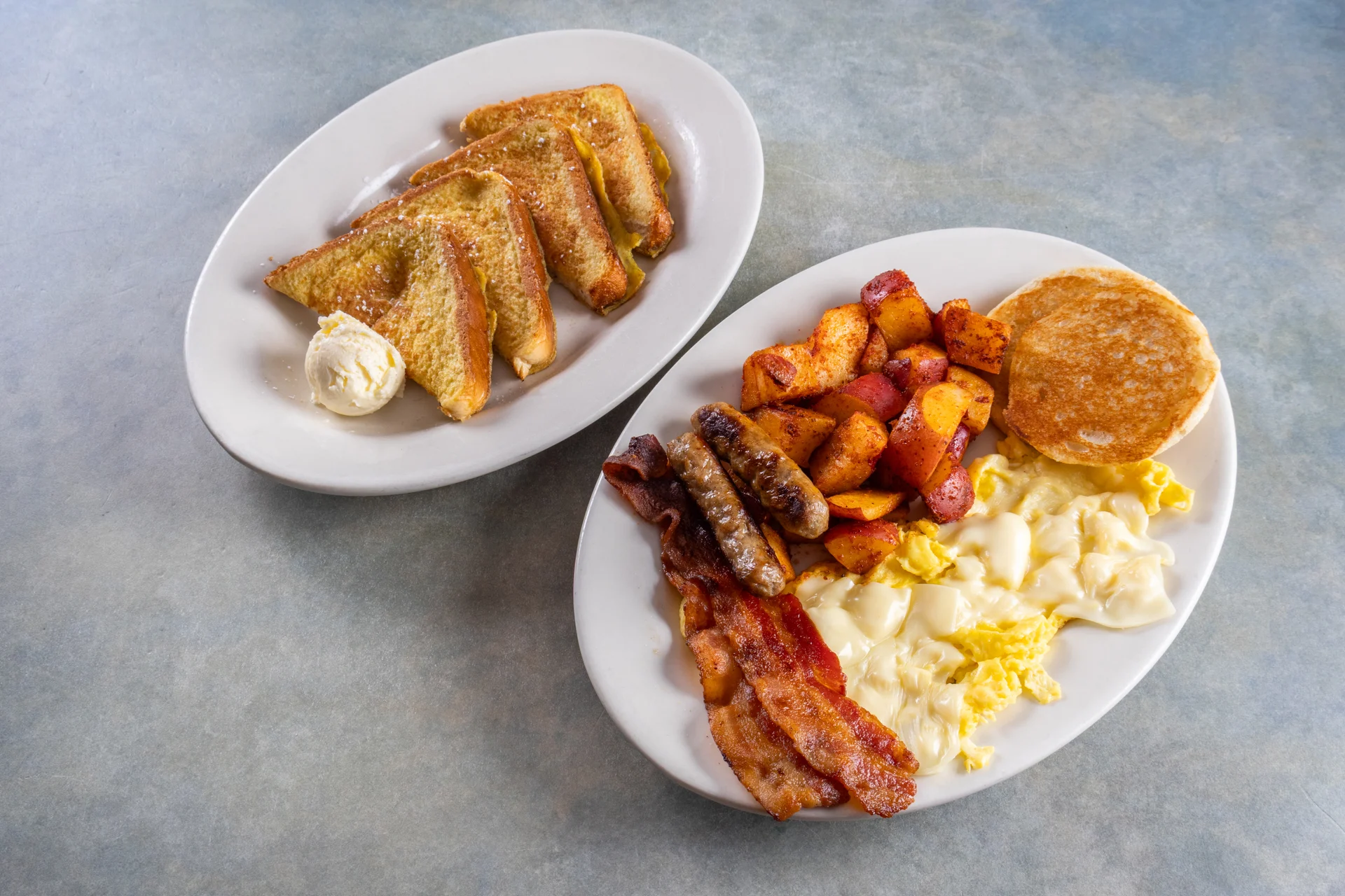 Two eggs, two bacon & sausage, choice of two pancakes or two pieces of french toast, served w/ homefries or tots & toast.