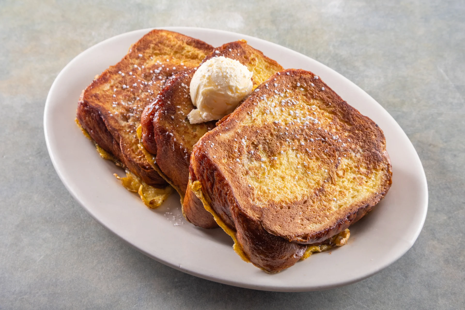 Four pieces of our homemade Texas style french toast, Topped w/ cinnamon & powdered sugar.