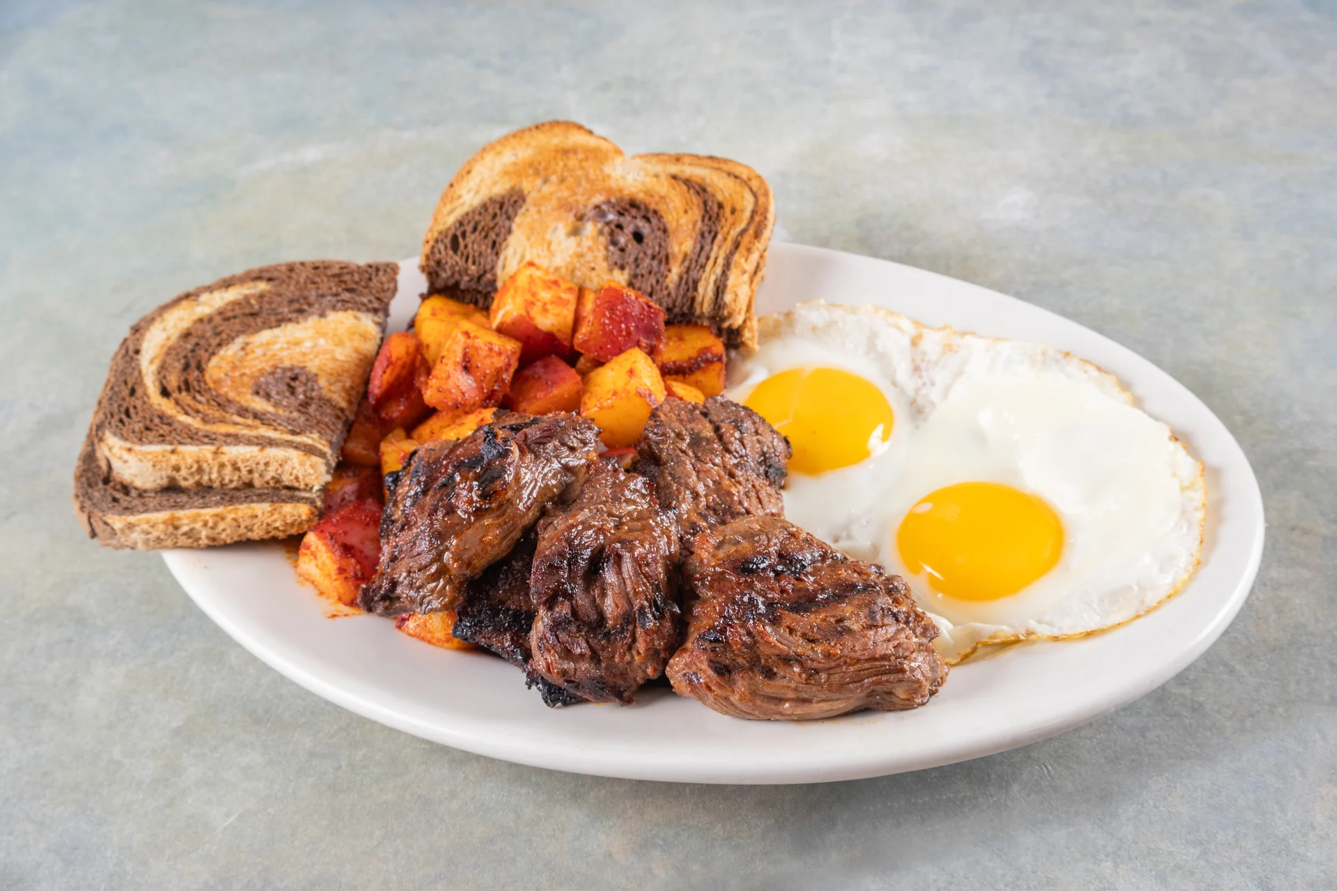 Our own marinated bourbon steak tips w/ two eggs any style & served w/ homefries or tots & toast.