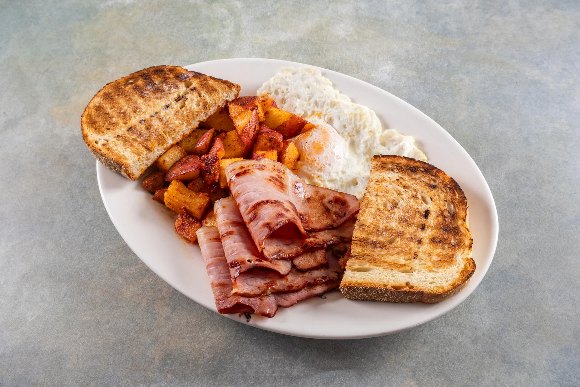 Two eggs any style, two bacon or sausage, choice of two small pancakes, two pieces of french toast, or a grilled muffin.