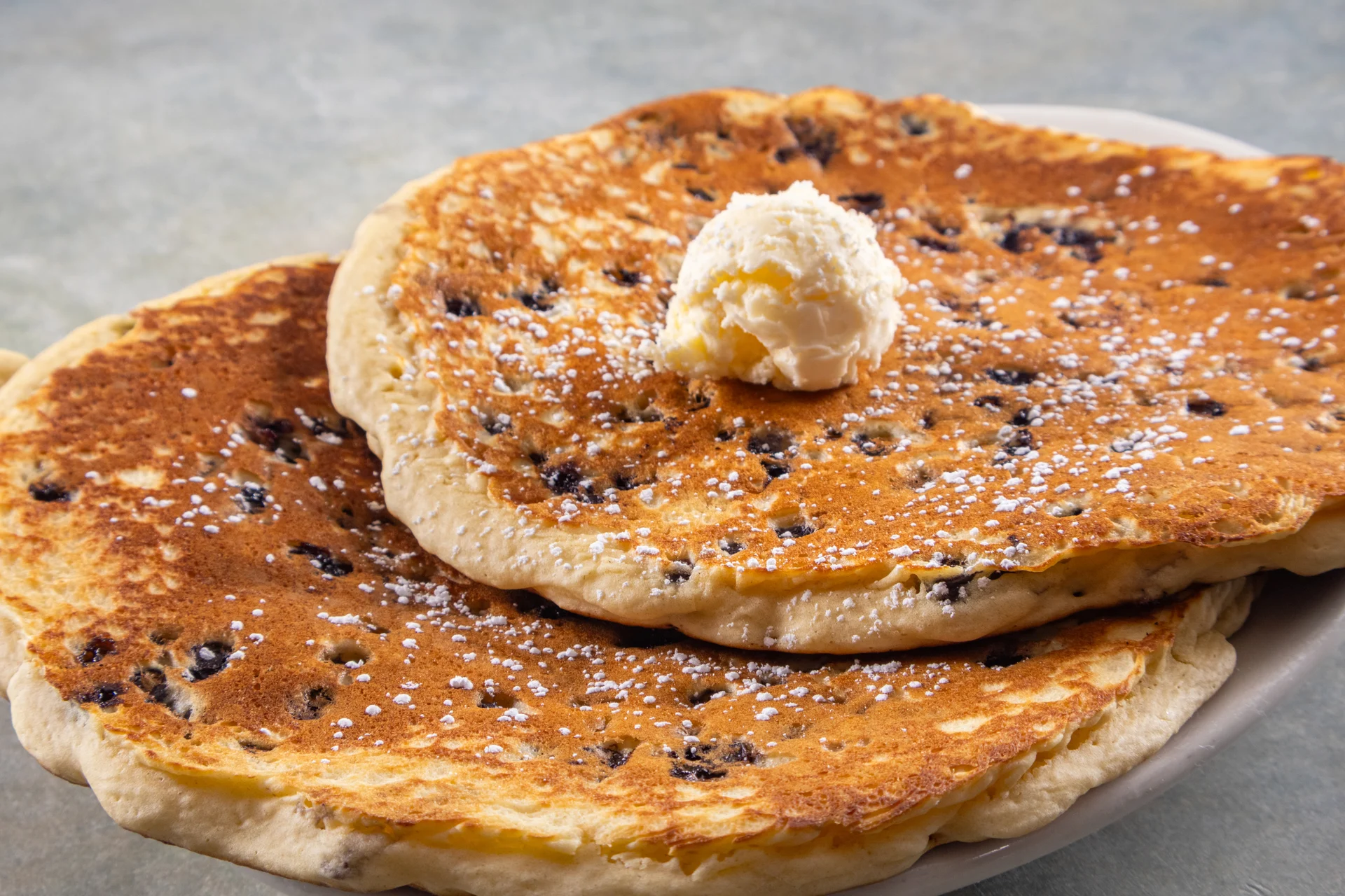 Two small pancakes or french toast. Topped w/ cinnamon, powdered sugar, and whipped butter.