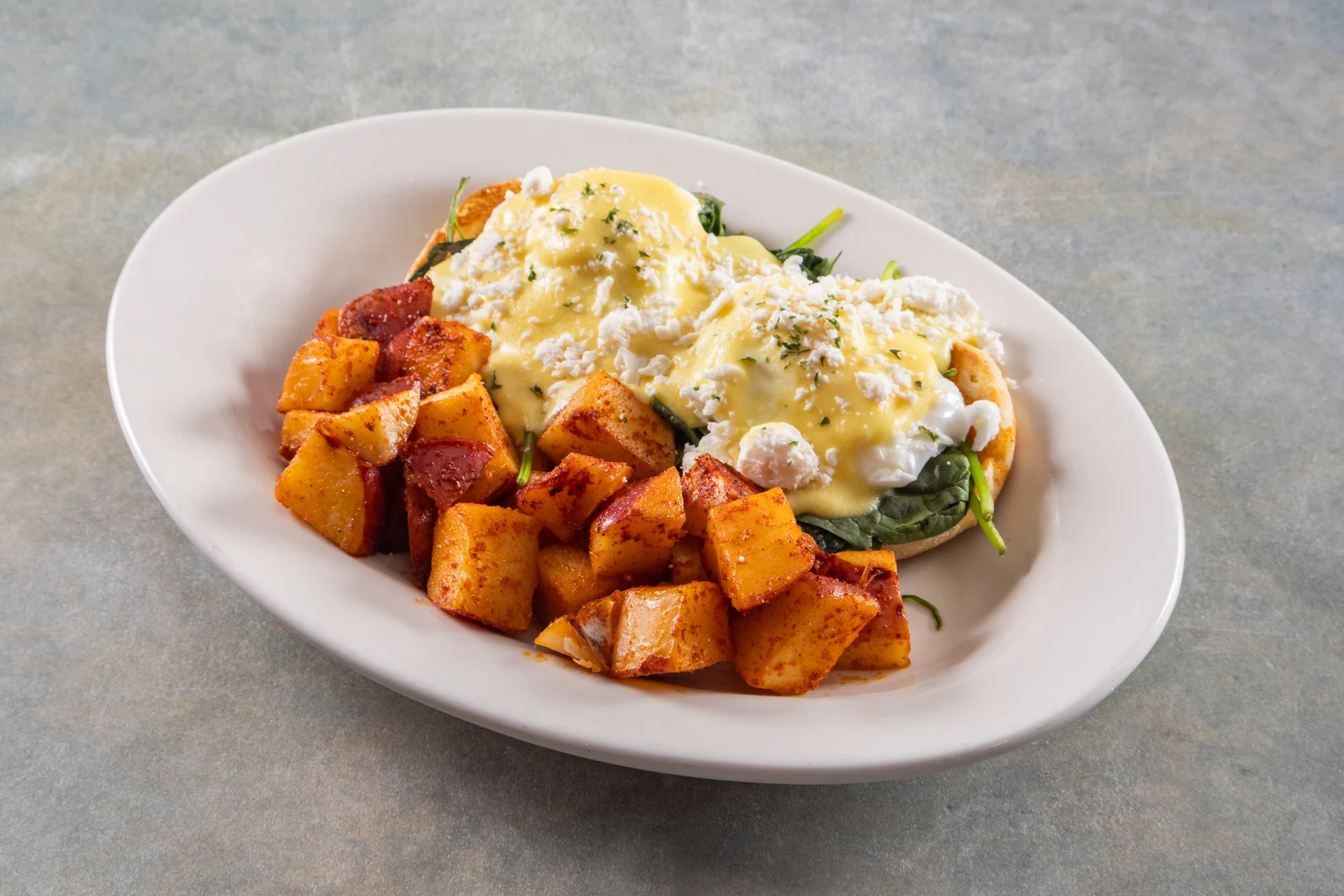 Grilled english muffin topped w/ fresh sautéed spinach, two poached eggs, feta cheese, & homemade hollandaise sauce.