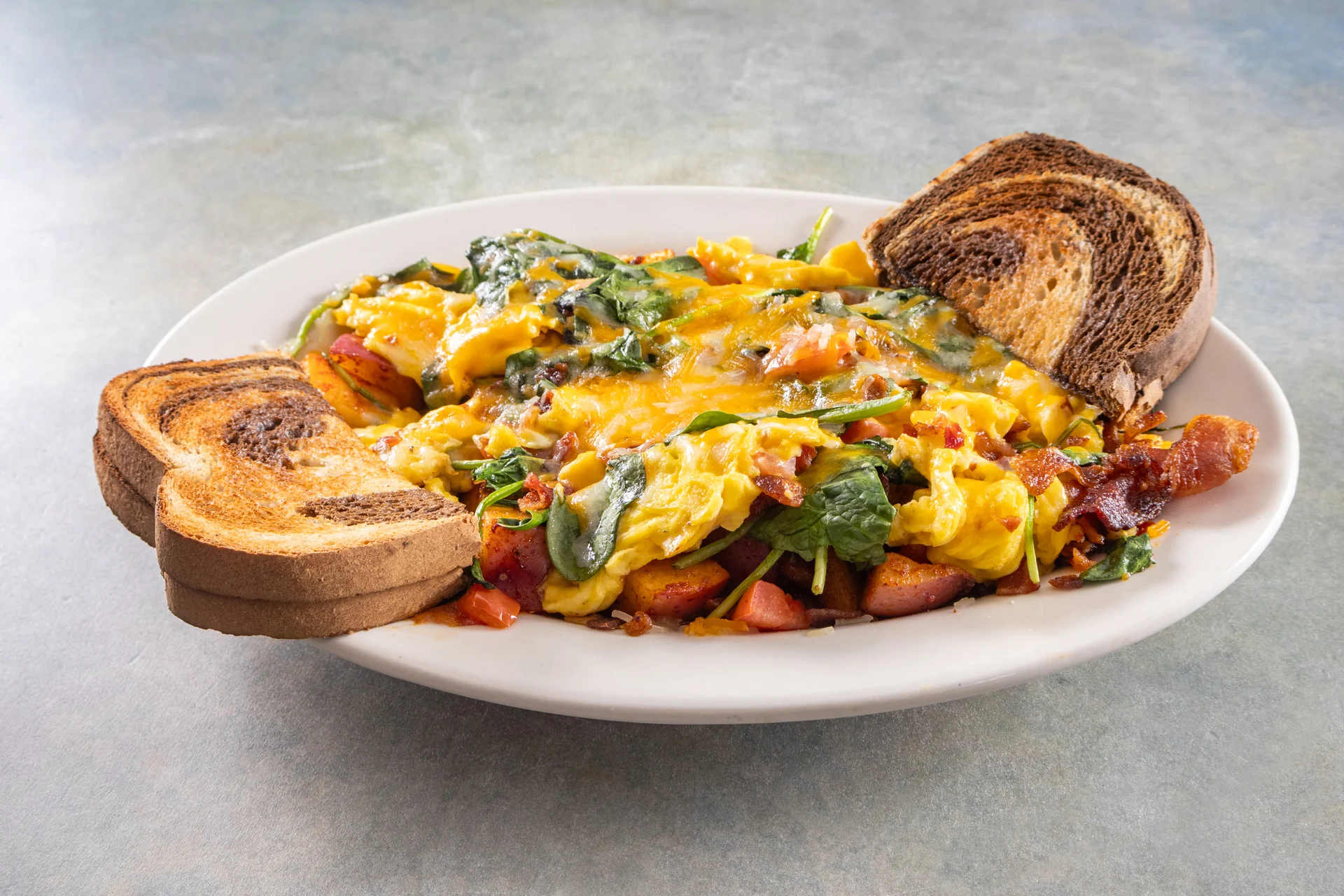 Scrambled eggs w/ choice of items mixed together w/ homefries or tots, & toast.