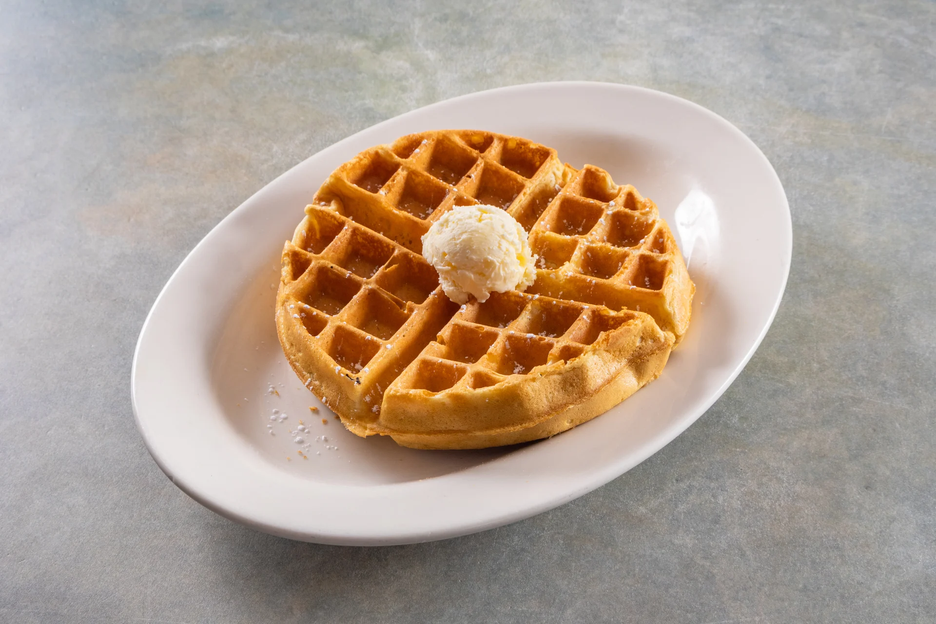 One homemade Belgian style waffle. Topped w/ powdered sugar & whipped butter.